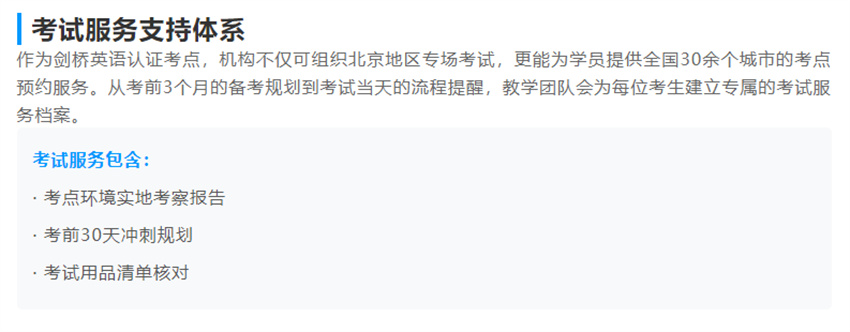 北京可組織機(jī)構(gòu)內(nèi)部專場(chǎng)考試,同時(shí)可代報(bào)全國大部分城市的KET/PET/FCE考試,考試前后提醒細(xì)致到位;