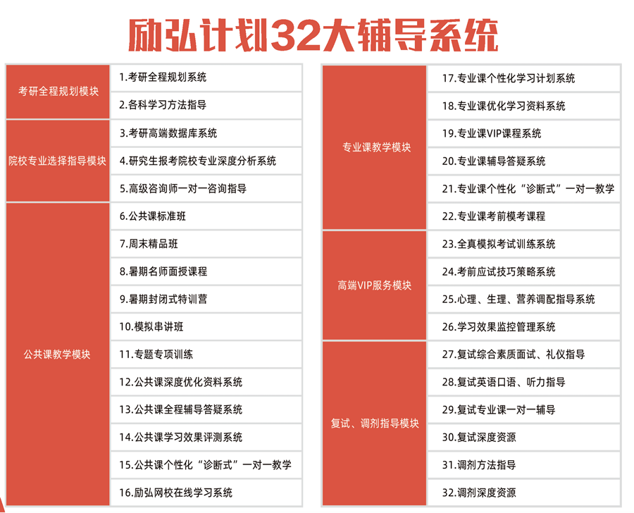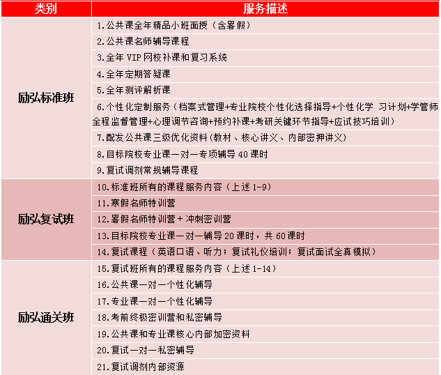 課程簡介: 勵弘計劃高端輔導課程是由勵弘·啟航教育集團創(chuàng)立并獨家掌握的最先進考研輔導體系,完全超越常規(guī)培訓效果,對考研成功率有著革命性突破的高端輔導系統(tǒng)。為學員提供全程全方位系統(tǒng)化的輔導,為您精準定位,提供全程個性化復習方案,步步跟進,全程指導;從報名服務起到復試結束,從公共課到專業(yè)課,從院校專業(yè)信息到導師選擇,從考研學科知識、應試技巧到調劑信息,以及心理、生理、營養(yǎng)調控等全方位幫助您全面提升核心競爭力,讓您在有限的時間里,輕松應對,全面提升。 課程體系: 輔導系統(tǒng): 學費標準: 服務描述: