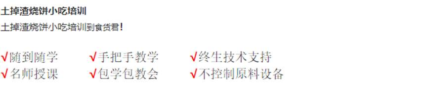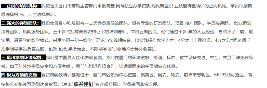開店流程講解,包括店面的選址、人員配備、物資采購等。項目技術詳細批解,包括原材料的選擇,采購,口味的變換、配比等。店鋪經(jīng)營小技巧,輕松創(chuàng)造財富。 專業(yè)老師一對一的實戰(zhàn)示范,講解技術。備原材料,老師旁邊檢查指導。老師實踐操作中帶領你回憶理論學習階段中的開店的技巧,原材料的選擇,采購,成本、預算。自己操作所有流程,制作出成品,老師旁邊檢查指導。學員動手實操,老師引導,熟透操作流程。 不限制學習時間,包教包會,學到自己滿意為止,一般3-5天左右。一般視個人而定。 隨到隨學手把手教學終生技術支持 名師授課包學包教會不控制原料設備