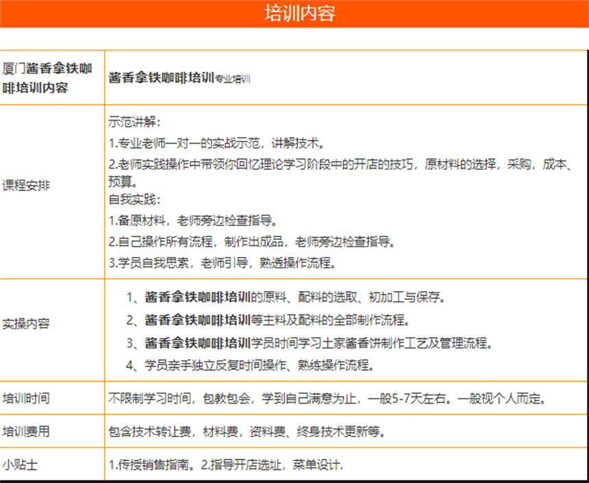 1.開店流程講解,包括店面的選址、人員配備、物資采購等。 2.項目技術(shù)詳細(xì)批解,包括原材料的選擇,采購,口味的變換、配比等。 3.店鋪經(jīng)營小技巧,輕松創(chuàng)造財富。 1、醬香拿鐵咖啡培訓(xùn)的原料、配料的選取、初加工與保存。 2、醬香拿鐵咖啡培訓(xùn)等主料及配料的全部制作流程。 3、醬香拿鐵咖啡培訓(xùn)學(xué)員時間學(xué)習(xí)土家醬香餅制作工藝及管理流程。 4、學(xué)員親手獨立反復(fù)時間操作、熟練操作流程。 √隨到隨學(xué)√手把手教學(xué)√終生技術(shù)支持 √名師授課√包學(xué)包教會√不控制原料設(shè)備