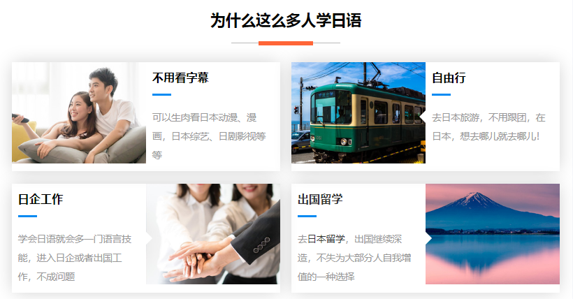 1、經(jīng)驗(yàn)豐富及具有資格認(rèn)證的外教:結(jié)合日本語(yǔ)言教育的精華,凝聚了具有豐富教學(xué)經(jīng)驗(yàn)的日本語(yǔ)言教授。