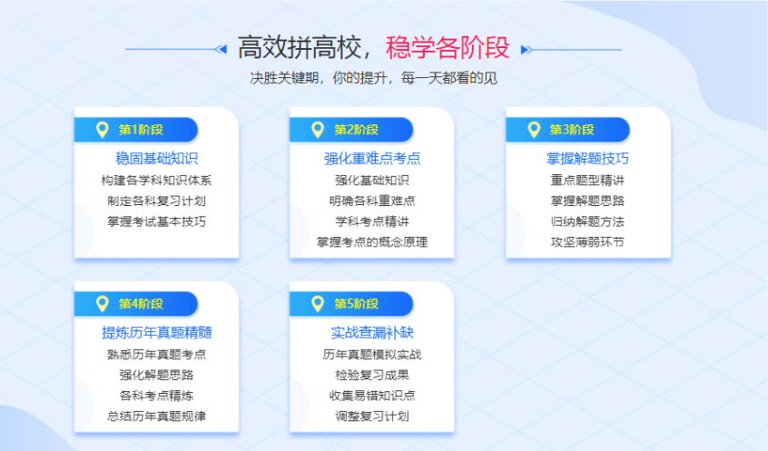 半年集訓營分階段教學,秋季以突破訓練為主,實時關注考綱情況,對薄弱環(huán)節(jié)進行集中訓練、反復記憶錯題。考前沖刺階段,利用理念模擬試題進行查漏補缺。