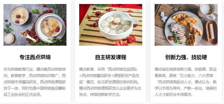 課程專業(yè):學(xué)校有精品烘焙面包、時(shí)尚蛋糕、法式甜點(diǎn)、西點(diǎn)慕斯、裱花、翻糖、咖啡飲品、西餐輕食簡(jiǎn)餐等熱門(mén)專業(yè)廣州排名前十的西點(diǎn)培訓(xùn)機(jī)構(gòu)。