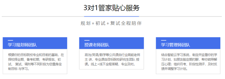 1.精細(xì)化服務(wù):聚創(chuàng)考研作為一家專業(yè)的考研輔導(dǎo)機(jī)構(gòu),,為考研學(xué)子提供貼心精細(xì)的服務(wù),通過(guò)“38人公共課小班課、專業(yè)課1對(duì)1授課及答疑、班主任全程督學(xué),擇校擇專業(yè)、高分作文批改、標(biāo)準(zhǔn)復(fù)試課程、精確診斷面授答疑、在線平臺(tái)答疑、在線補(bǔ)課系統(tǒng)、全套初試輔導(dǎo)書(shū)講義”等十項(xiàng)服務(wù),幫助考生締造高分佳績(jī),實(shí)現(xiàn)名校夢(mèng)想!