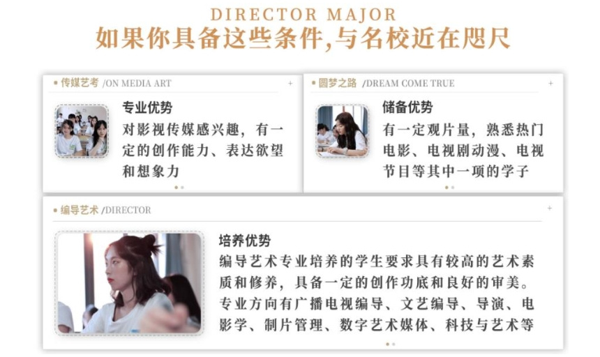 編導(dǎo)不像美術(shù)、音樂、舞蹈,需要從小就開始練習(xí)基本功,要有一定的專業(yè)基礎(chǔ)和天賦,也不像播音、表演等專業(yè),需要一定的肢體、聲音技巧等訓(xùn)練。編導(dǎo)專業(yè)在藝術(shù)類專業(yè)中是最接近文化課的專業(yè),它考察的是文學(xué)素養(yǎng),培養(yǎng)學(xué)生的影視創(chuàng)新思維、綜合寫作能力,所以是大多數(shù)同學(xué)都可以選擇的藝術(shù)類專業(yè)。