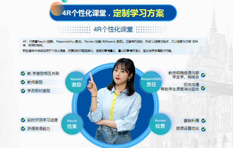 3、雅思教材體系,從第一代到第七代更新,接近考試變化,受到大多數(shù)考生的好評,采用中外教師相結(jié)合的課堂模式,提供良好的英語學習環(huán)境。