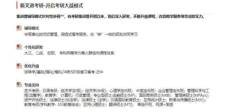 3、新東方考研專注于市場化的教育培訓(xùn)機(jī)構(gòu)無法觸及的領(lǐng)域;專注于私密化和個性化的教育培訓(xùn)。對于學(xué)科薄弱的考生提供一對一或者一對多單科補(bǔ)差,幫助學(xué)員整體提升考研成績。