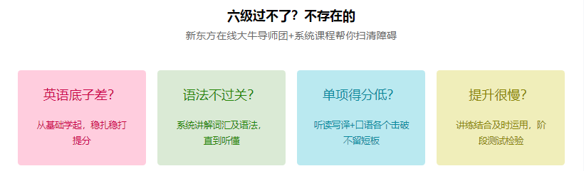 小編來(lái)為大家推薦新東方考研開設(shè)大學(xué)英語(yǔ)四級(jí)無(wú)憂計(jì)劃,全程規(guī)劃,幫您安排好了階段進(jìn)程和每天學(xué)習(xí)的內(nèi)容,由易到難、循序漸進(jìn)講解,幫助大家備考大學(xué)英語(yǔ)四級(jí)考試!
