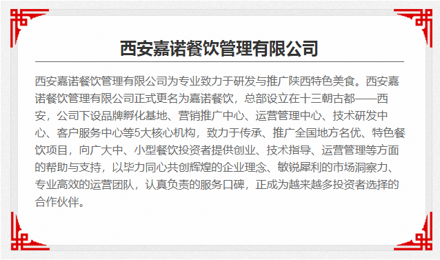 西安餐飲培訓(xùn)機(jī)構(gòu)前十排名的西安嘉諾餐飲管理有限公司為專業(yè)致力于研發(fā)與推廣陜西特色美食。西安嘉諾餐飲管理有限公司正式更名為嘉諾餐飲,總部設(shè)立在十三朝古都——西安,公司下設(shè)品牌孵化基地、營銷推廣中心、運(yùn)營管理中心、技術(shù)研發(fā)中心、客戶服務(wù)中心等5大核心機(jī)構(gòu)