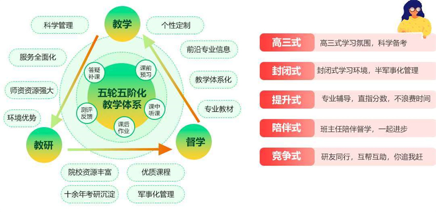 2.精細(xì)化服務(wù):我們的考研封閉式集訓(xùn)營主要通過“38人公共課小班課、擇校擇專業(yè)、專業(yè)課1對1授課及答疑、班主任全程督學(xué)、精確診斷面授答疑、高分作文批改、在線補課系統(tǒng)、在線平臺答疑、標(biāo)準(zhǔn)復(fù)試課程、全套初試輔導(dǎo)書講義”等十項服務(wù),為考研學(xué)子提供貼心精細(xì)的服務(wù),幫助考生締造高分佳績,實現(xiàn)有名高校夢想!