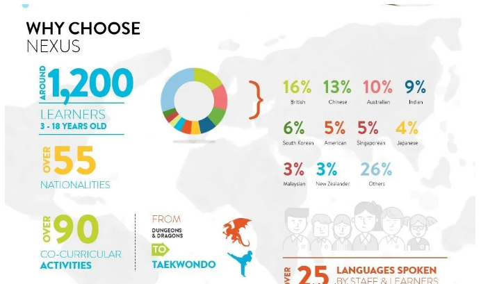 萊仕國際新校園坐落在東海岸的加冷和巴耶利峇地鐵站之間,交通便利。目前有1200個在讀學(xué)生,來自50多個不同國籍,其中占比最大的幾個國籍有英國(16%)、中國(13%)、澳大利亞(10%)、印度(9%)、韓國(6%)、美國(5%)。