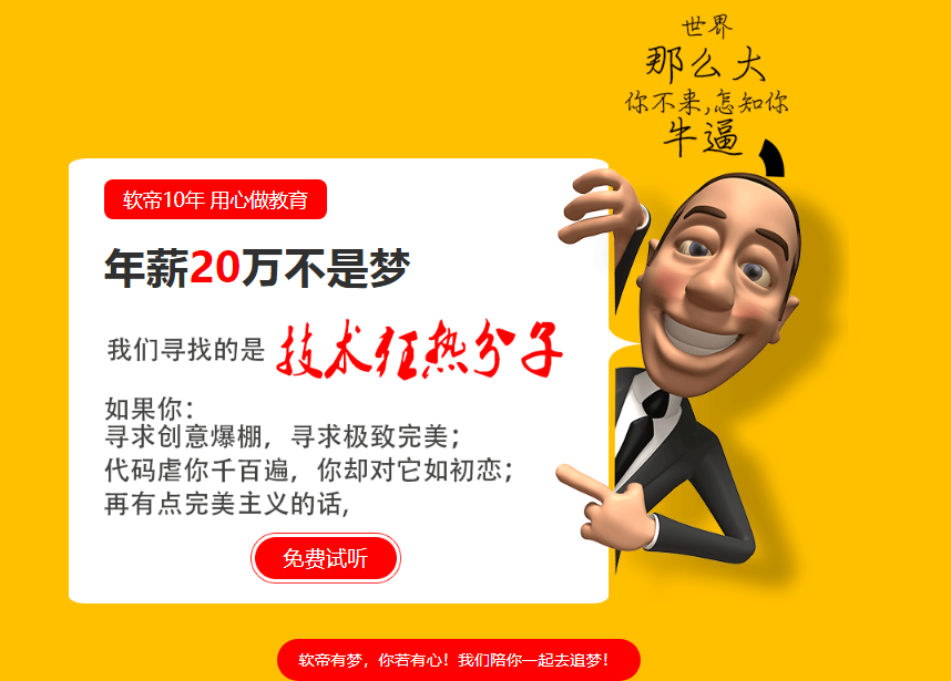 混合式開發(fā)引領(lǐng)成神之路、師資團(tuán)隊雄厚、管理制度嚴(yán)格、全程職業(yè)素養(yǎng)課、量身定制職業(yè)規(guī)劃、就業(yè)更全面更專業(yè)、入學(xué)簽訂就業(yè)協(xié)議、提供再就業(yè)服務(wù)。