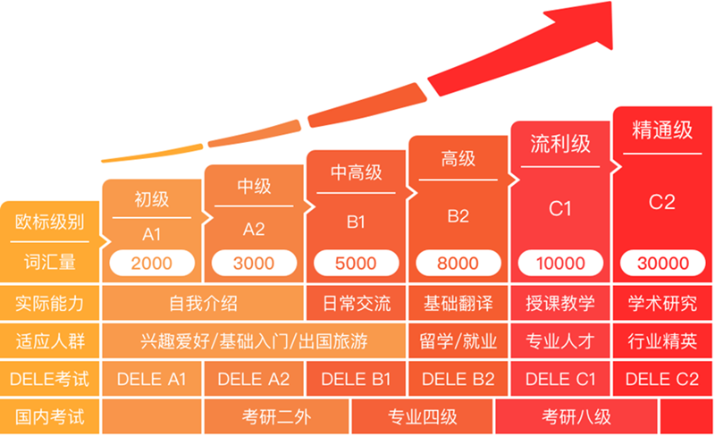[課程目標]通過各階段的學習,掌握西語的語音、語法、聽說、寫作的階段標準,最終通過DELE或者SIELE的歐標考試