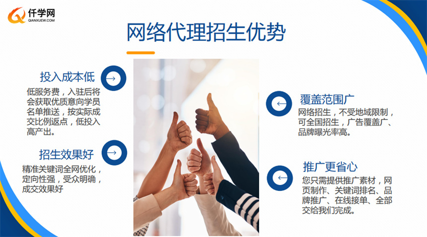 精選國內(nèi)實(shí)力比較強(qiáng)的第三方代理招生平臺排行榜一覽;現(xiàn)在社會網(wǎng)絡(luò)化信息化,經(jīng)濟(jì)的飛速發(fā)展,代理招生該機(jī)構(gòu)已成為教育機(jī)構(gòu)的主要生源之一,由于教育機(jī)構(gòu)的學(xué)生目標(biāo)大,相對分散,有時教育機(jī)構(gòu)本身的財(cái)務(wù)、人力和經(jīng)驗(yàn)無法管理一個巨大的招生市場。互聯(lián)網(wǎng)上的各種網(wǎng)站都不均衡,有什么正式的代理招生網(wǎng)站嗎?在資源整合時代,由于成本高,越來越多的機(jī)構(gòu)選擇代理招生,招生網(wǎng)站選擇仟學(xué)網(wǎng)。下面就詳細(xì)為大家介紹;