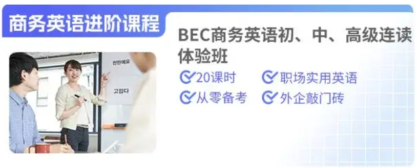 BEC初級(jí)班:掌握BEC初級(jí)商務(wù)英語核心詞匯、短語和慣用搭配,能夠在大多商務(wù)場(chǎng)景下準(zhǔn)確使用;掌握常見商務(wù)場(chǎng)合基本的口頭和郵件溝通能力,輕松進(jìn)行基本溝通;熟悉BEC初級(jí)考試的題型和常用答題技巧,順利通過考試。