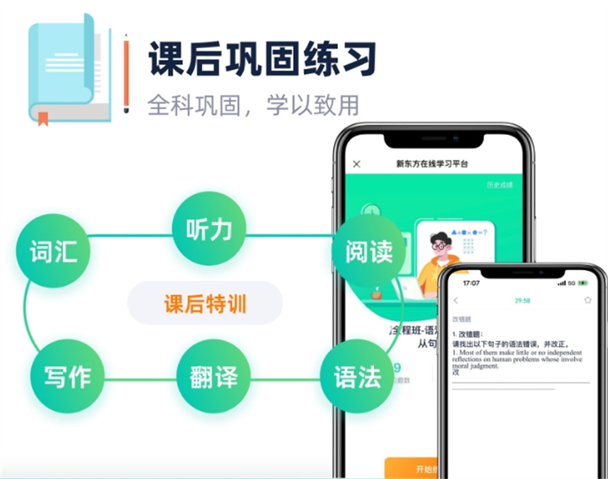 專屬批改:作文精批,精準定位問題,匹配專業(yè)師資批改作文,臨考助攻;智能助學,完善閉環(huán),直播互動答題,小程序伴學,階段測試,作文批改。