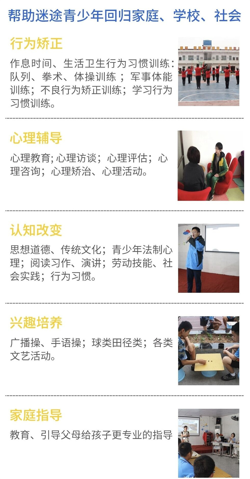 9.實行“一訓二教(一訓即軍事訓練;二教即心理教育與基礎文化課教育)”相結合的教學轉變模式,免除家長對孩子文化課缺漏的煩惱。