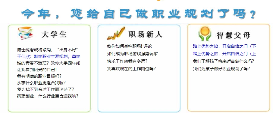 4大北京大三職業(yè)生涯規(guī)劃教育機(jī)構(gòu)名單匯總一覽:你是否對(duì)未來的生涯規(guī)劃感到迷茫?不會(huì)挖掘自身擅長(zhǎng)?無法選擇就業(yè)方向?應(yīng)對(duì)面試,你是否有許多困惑?華普生涯的職業(yè)生涯指導(dǎo)幫你來答疑解難!我們以學(xué)生成長(zhǎng)發(fā)展需求為出發(fā)點(diǎn),以引導(dǎo)大學(xué)生實(shí)現(xiàn)自主選擇發(fā)展為落腳點(diǎn),實(shí)施“強(qiáng)引領(lǐng)有組織高質(zhì)量精細(xì)化”的生涯教育與就業(yè)指導(dǎo)!無論你是低年級(jí)還是即將走向職場(chǎng)的畢業(yè)生,都可以在這里尋找答案!