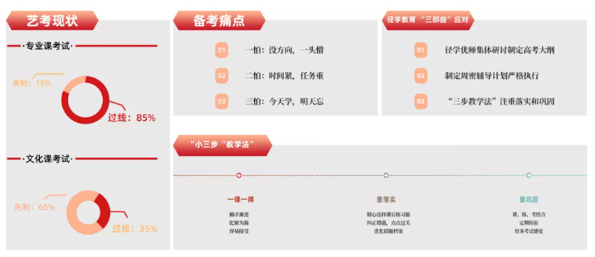 1、針對藝考生基礎比較薄弱的特點,授課時著重強化弱科學習,制定完善的學習計劃,掌握各學科基本學習方法和答題技巧,提高應對考試的能力。