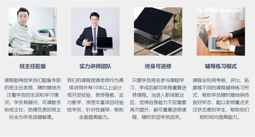 終身可進(jìn)修:只要學(xué)員報(bào)名參與課程學(xué)習(xí),學(xué)成后都可終身重復(fù)進(jìn)修課程。當(dāng)進(jìn)入職場(chǎng)就業(yè)后,覺(jué)得自身能力不足需要再次提升,都可重復(fù)進(jìn)修課程,隨時(shí)歡迎學(xué)員回來(lái)。