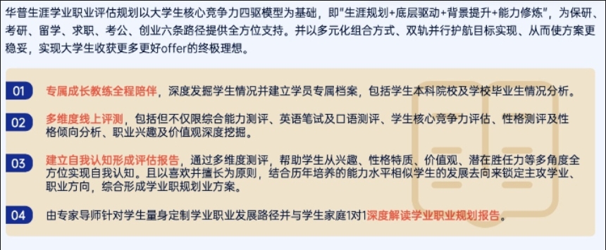 西安大學(xué)生生涯規(guī)劃服務(wù)機(jī)構(gòu)10大排名推薦:華普生涯是華普億方集團(tuán)旗下專注于大學(xué)生學(xué)職生涯規(guī)劃管理服務(wù)的子品牌,華普生涯深度整合高校、企業(yè)、專家、行業(yè)優(yōu)勢資源,以終為始打造大學(xué)生涯規(guī)劃全周期服務(wù),為大學(xué)生提供一站式的“升學(xué)、就業(yè)、創(chuàng)業(yè)、保研、考公、考研”規(guī)劃方案。將就業(yè)、創(chuàng)業(yè)目標(biāo)與學(xué)業(yè)目標(biāo)有機(jī)統(tǒng)一,疏通全路徑發(fā)展障礙,專屬生涯教練全程引領(lǐng),多領(lǐng)域?qū)I(yè)導(dǎo)師全方位賦能,構(gòu)建核心競爭力,打造差異化優(yōu)勢,讓青年學(xué)子領(lǐng)跑大學(xué),贏在未來