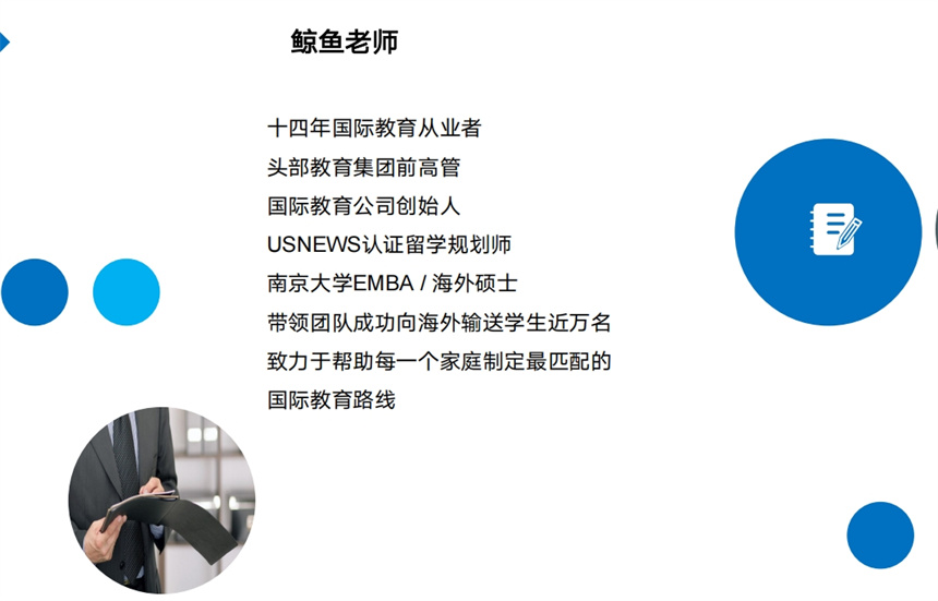 這里主要先介紹下關(guān)于北京5大美國留學(xué)口碑好的留學(xué)機(jī)構(gòu)名單排名匯總之一的鯨宇國際教育,鯨宇國際教育由資深留學(xué)行業(yè)經(jīng)驗(yàn)的師資創(chuàng)辦于南京專注世界TOP50名校規(guī)劃與申請,目前分別有團(tuán)隊(duì)base在南京,北京,上海。師資團(tuán)隊(duì)均具有頭部教育集團(tuán)5-15年工作經(jīng)驗(yàn),全海外學(xué)歷背景。鯨宇留學(xué)區(qū)別于大機(jī)構(gòu)的流水線作業(yè),致力于給學(xué)生提供更高端更精細(xì)化的服務(wù),幫助學(xué)生申請到超人均水平的理想目標(biāo)名校,實(shí)現(xiàn)滿意就業(yè)。