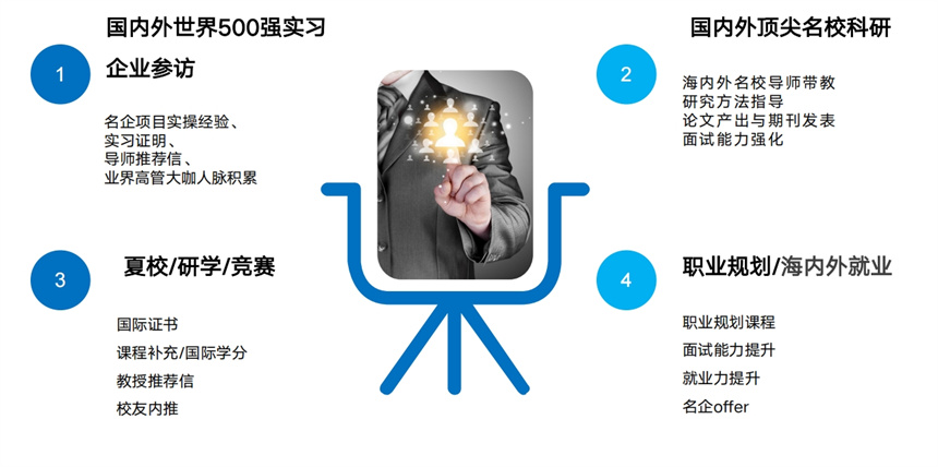 3.以就業(yè)為導向,重視規(guī)劃結合學生現(xiàn)有背景和申請目標,為其制定科學、個性化的提升方案,既重視硬性成績標準,又強調軟性背景提升規(guī)劃,為學生賦能提升申請實力和就業(yè)力。