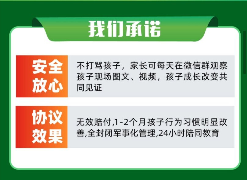 全封閉式軍事化管理:學校采取全封閉式軍事化管理,老師、教官、學生同吃同住,學校全年無休假,全托教學,培養(yǎng)孩子紀律意識。