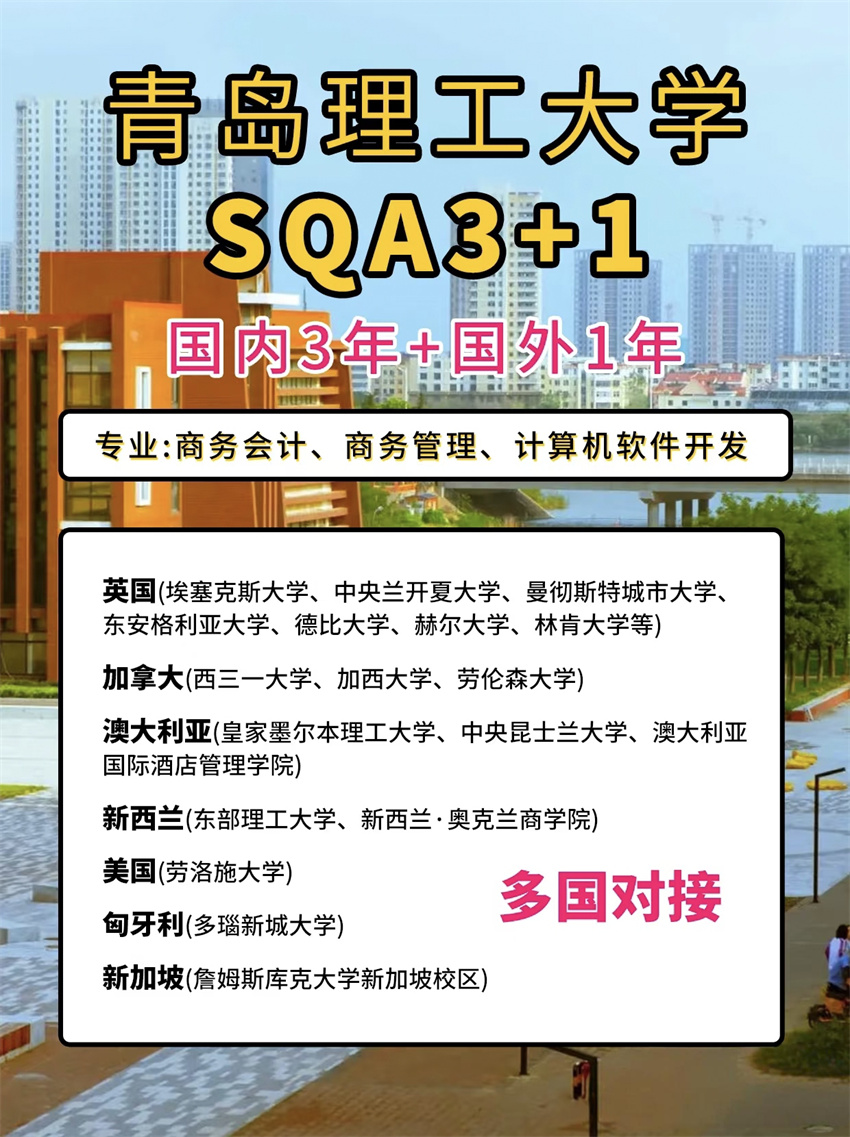 1、青島理工大學(xué):引進(jìn)SQA 3+1項目,通過在青島理工大學(xué)三年的全日制學(xué)習(xí),能夠具備夠熟練的運用英語,并掌握相關(guān)專業(yè)的國際化、前沿的知識和技能,之后選擇英國、美國、加拿大、澳大利亞、新西蘭、馬來西亞、新加坡、荷蘭等國家的百余所大學(xué)繼續(xù)深造。