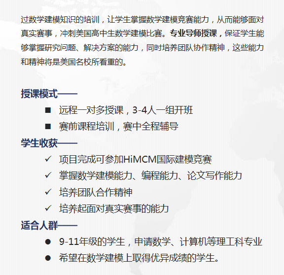 比賽含金量極高,具有國際影響力,競賽成績是申請美國,香港,新加坡學(xué)校的加分參考依據(jù);是美本申請含金量類別的學(xué)術(shù)競賽之一。訓(xùn)練和比賽,培養(yǎng)用數(shù)學(xué)方法解決實(shí)際問題,在團(tuán)結(jié)合作中發(fā)揮集體力量攻關(guān)的意識和能力,提高問題的分解分析,模型的假設(shè)和建立,計(jì)算結(jié)果及討論,撰寫專業(yè)學(xué)術(shù)論文的能力,為日后研究學(xué)習(xí)做鋪墊。計(jì)算機(jī),自然科學(xué),社會(huì)經(jīng)濟(jì)等多個(gè)方面的綜合能力,對未來相關(guān)大學(xué)專業(yè)的選擇有提前認(rèn)識。