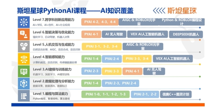 斯坦星球創(chuàng)立于2016年,在借鑒國(guó)際先進(jìn)STEM教育理念和實(shí)踐的基礎(chǔ)上,精心打造了一套整合式STEM&AI課程體系。針對(duì)3-18歲青少年的興趣和特長(zhǎng),規(guī)劃了人工智能、信息學(xué)奧賽、機(jī)器人編程、科創(chuàng)發(fā)明四大核心學(xué)習(xí)路徑,為孩子的科技成長(zhǎng)提供多元發(fā)展方向。具體涵蓋Python AI編程、信奧C++、VEX機(jī)器人、科創(chuàng)發(fā)明、科學(xué)實(shí)驗(yàn)、積木搭建、機(jī)械工程、思維訓(xùn)練、戶(hù)外研學(xué)等豐富內(nèi)容,并借助國(guó)內(nèi)外優(yōu)質(zhì)的軟硬件平臺(tái)和前沿技術(shù),幫助孩子更好地理解并應(yīng)用。