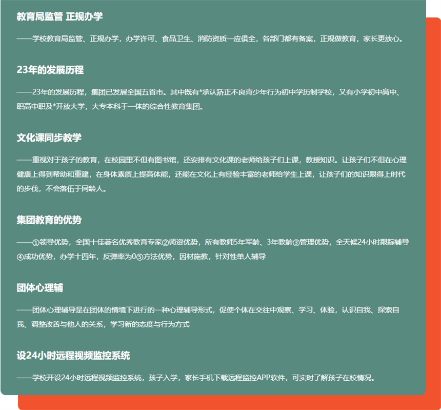 是一家針對(duì)厭學(xué)、網(wǎng)癮、早戀、逃學(xué)、輟學(xué)、打架、打罵父母、親情冷漠,性格怪異、自卑、自閉、焦慮,抑郁、不懂感恩、脾氣暴躁、揮霍無度、混跡社會(huì)等孩子的行為矯正特訓(xùn)基地。