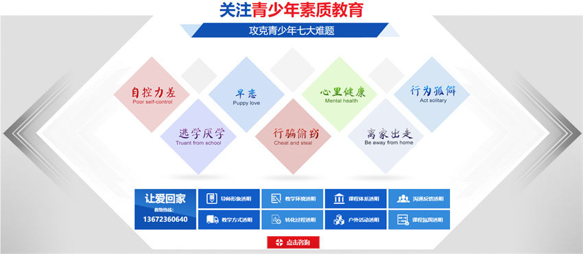 正德素質(zhì)教育招收8-18歲網(wǎng)癮、叛逆、厭學(xué)、牌氣暴躁、抽煙打架、奢侈消費、混跡社會、親情冷漠述學(xué)、離家出走、內(nèi)向、學(xué)習(xí)度不端正、和父母關(guān)系不好、缺乏自控力、感情冷漠、小偷小摸、早戀網(wǎng)戀等問題青少年。