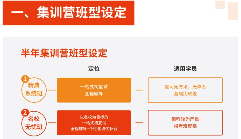 適用對(duì)象:大四及以上,基礎(chǔ)薄弱,自控力差的學(xué)生;有半年以上復(fù)習(xí)周期需要氛圍的脫產(chǎn)學(xué)生;二戰(zhàn)及以上沖擊熱門院校熱門專業(yè)的學(xué)生