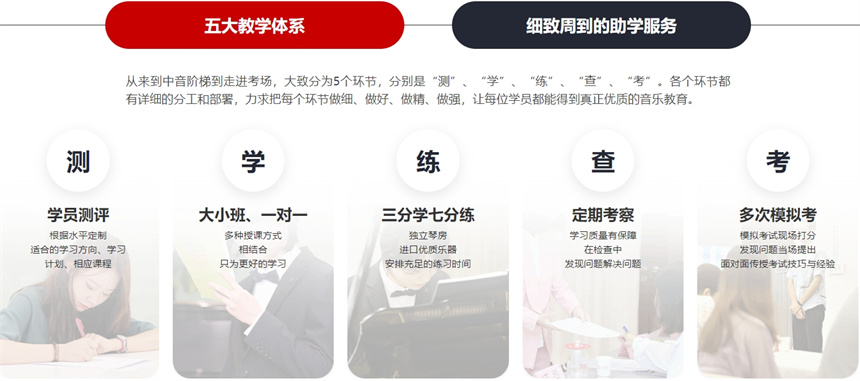 我們音樂(lè)藝考培訓(xùn)機(jī)構(gòu)為各教學(xué)科目量身打造了具有專業(yè)特色的教學(xué)空間,包括鋼琴教室、聲樂(lè)教室、民樂(lè)教室、公共課教室、學(xué)院休息區(qū)等,同時(shí)機(jī)構(gòu)還配置有國(guó)外進(jìn)口鋼琴,先進(jìn)的通俗演唱設(shè)備,以及對(duì)標(biāo)音樂(lè)學(xué)院的專業(yè)琴房,為學(xué)員提供優(yōu)越的教學(xué)保障。