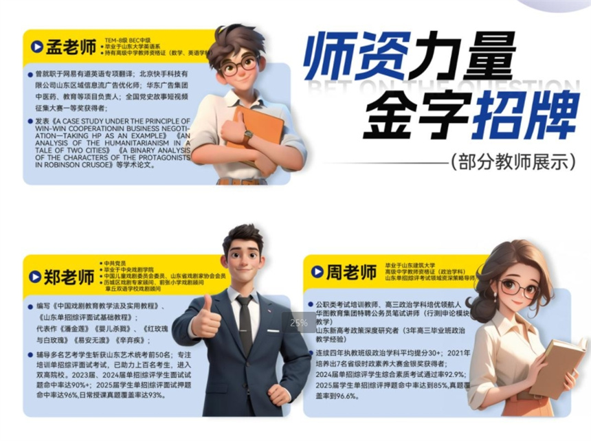 在2024-2025單招綜評考試中再創(chuàng)業(yè)界佳績,實現(xiàn)跨越式發(fā)展;精準押中58所招生院??荚囌骖}(語數(shù)英),成功預測24所招生院校面試真題,綜合素質課程涵蓋85%的素質測試原題,配合“綜合素質評價云平臺”的100%填寫完善服務,形成業(yè)內獨有的教考一體化升學方案。