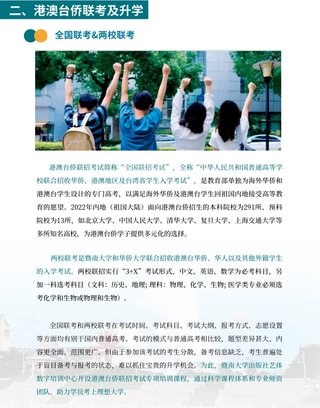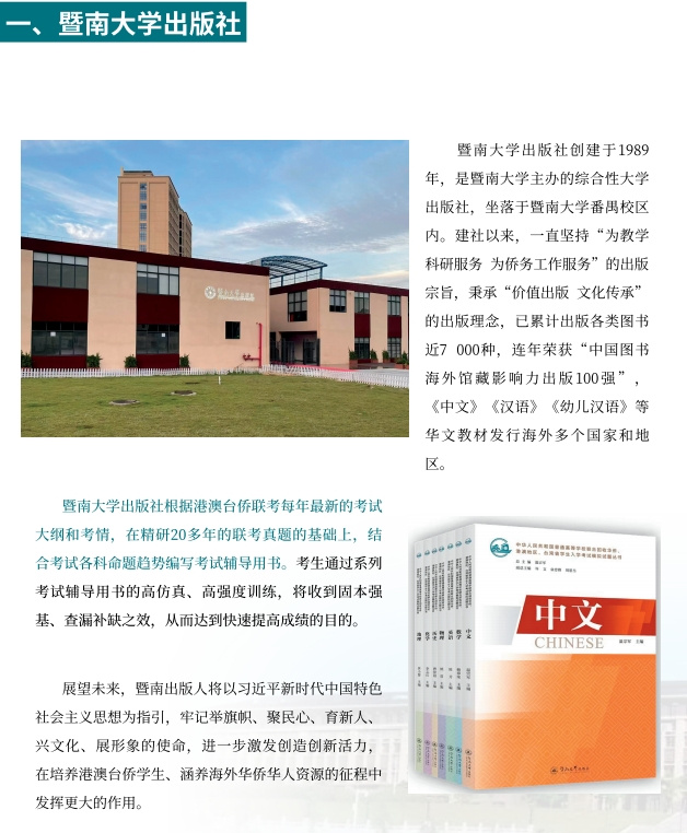 暨南?學(xué)出版社根據(jù)港澳臺僑聯(lián)考每年最新的考試?綱和考情,在精研20多年的聯(lián)考真題的基礎(chǔ)上,結(jié)合考試各科命題趨勢編寫考試輔導(dǎo)?書???通過系列考試輔導(dǎo)?書的?仿真、?強(qiáng)度訓(xùn)練,將收到固本強(qiáng)基、查漏補(bǔ)缺之效,從而達(dá)到快速提?成績的?的。展望未來,暨南出版?將以習(xí)近平新時(shí)代中國特?社會主義思想為指引,牢記舉旗幟、聚??、育新?、興?化、展形象的使命,進(jìn)?步激發(fā)創(chuàng)造創(chuàng)新活?,在培養(yǎng)港澳臺僑學(xué)?、涵養(yǎng)海外華僑華?資源的征程中發(fā)揮更?的作?。