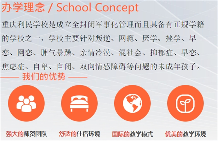 利民學(xué)校成立于2001年8月、是重慶市大足區(qū)人民政府專門委員會(huì)委托接受對(duì)13歲到17歲未成年學(xué)生厭學(xué)、逃學(xué)、叛逆、抑郁等行為進(jìn)行矯正、心理疏導(dǎo)、軍事訓(xùn)練等工作的專門定點(diǎn)學(xué)校及教育基地。