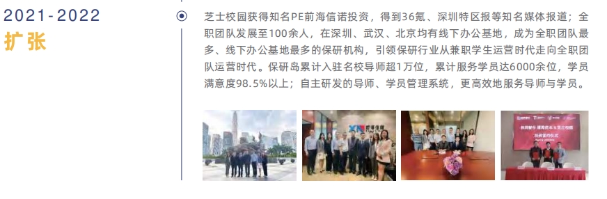 旗下?lián)碛斜Q袓u、保研留學(xué)島、保研考研島、科研島、考博島等品牌,旗下?lián)碛兄T多985/211大學(xué)規(guī)劃領(lǐng)域的頂流IP:銳哥說(shuō)升學(xué)、清華杜老師大學(xué)規(guī)劃,北大老費(fèi)聊保研、北大墨墨學(xué)姐、洲洲老師,并與數(shù)百家知名教育公司達(dá)成戰(zhàn)略合作,包括上市公司以及各省份頭部教育機(jī)構(gòu)。獲得前海信諾等知名機(jī)構(gòu)投資,獲得36氪、南方日?qǐng)?bào)、深圳特區(qū)報(bào)、獵云網(wǎng)等知名媒體報(bào)道,與清華ispace戰(zhàn)略合作,獲評(píng)國(guó)家高新技術(shù)企業(yè)。